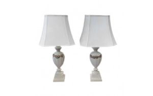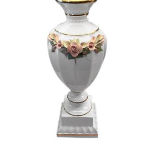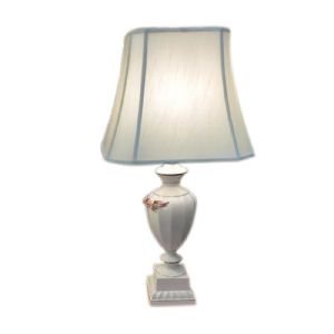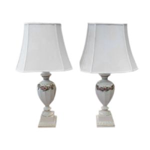 20th Century Rose Table Lamps in the style of Cordey. Sold as a set of two. Pedestal urn-style table lamps. White procelain glaze with raised rose details. Raised rose accents in pink and green, painted gold detailing. Textured off-white lamp shades, porcelain finials with old wiring. Width - 15", Depth - 15", Height - 30", Lamp Shade - Height 12". Hollywood Regency Style. Wear commensutae with age. Minor loss of finish, slight chip on one flower. Pieces are in working condition.